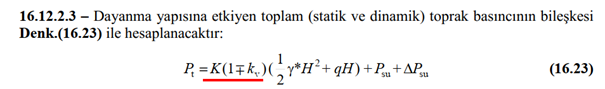 TBDY 2018 16.23 te dayanma yapılarına etkiye toplam statik ve dinamik kuvvet formülündeki (1±kv) çarpan, 16.24 formülleriyle hesaplanan toplam toplam aktif katsayısını arttırmalıdır.